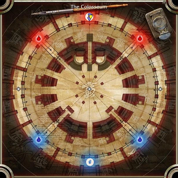 Colosseum is an elimination 4v4 and carnage map which has a circular inner arena surrounded by a circular corridor connected by short tunnels. The layout of power-ups, jump pads, and team nodes are different between the gametypes.
