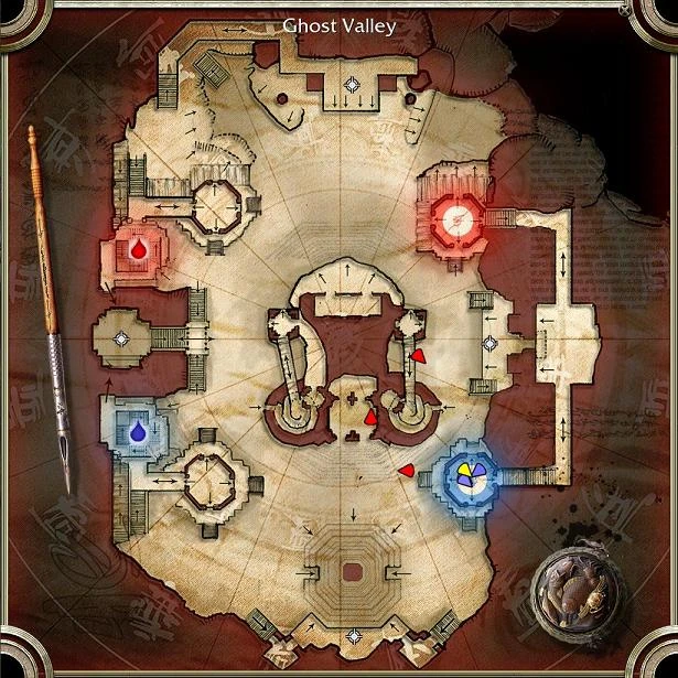Ghost Valley is a carnage map set in dark, dirty stone ruins with a large tower at the center. There are four team nodes to the north, south, east, and west. Players spawn to the east and teleport to the outskirts of the map through portals. They deliver blood tokens to the west at their respective drop points atop a small structure.