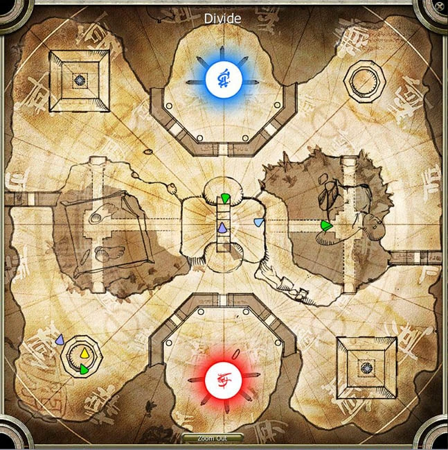 Divide is a vortex map with underground tunnels that span from east to west. At the center of the map is a metal bridge across a deep chasm which connects the tunnels. There are two team nodes on this map located inside stone structures at the northwest and southeast corners. The perkon travels back and forth in the chasm and through the tunnels at the middle of the map.